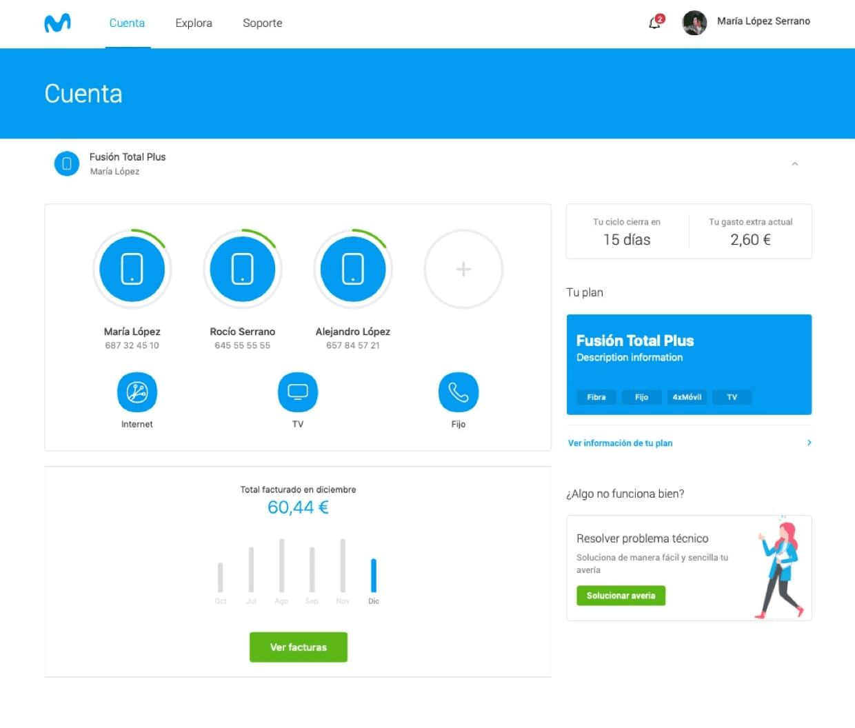 Integration of the "Account" product included consumer accounts, expense control, billing cycles, purchase of bonuses, packages, services, and checkout processes in 16 countries for the Tuenti brand in Latin America and Spain. I collaborated in expanding the same product to leading brands such as Movistar in Latin America and Spain, Vivo in Brazil, and O2 in the United Kingdom, working closely with the respective Business Operations (OB) teams.